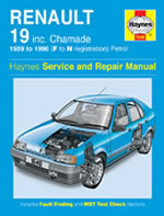 • Capa do manual Haynes para Renault 19 inc. Chamade com imagem do carro azul e descrição do serviço