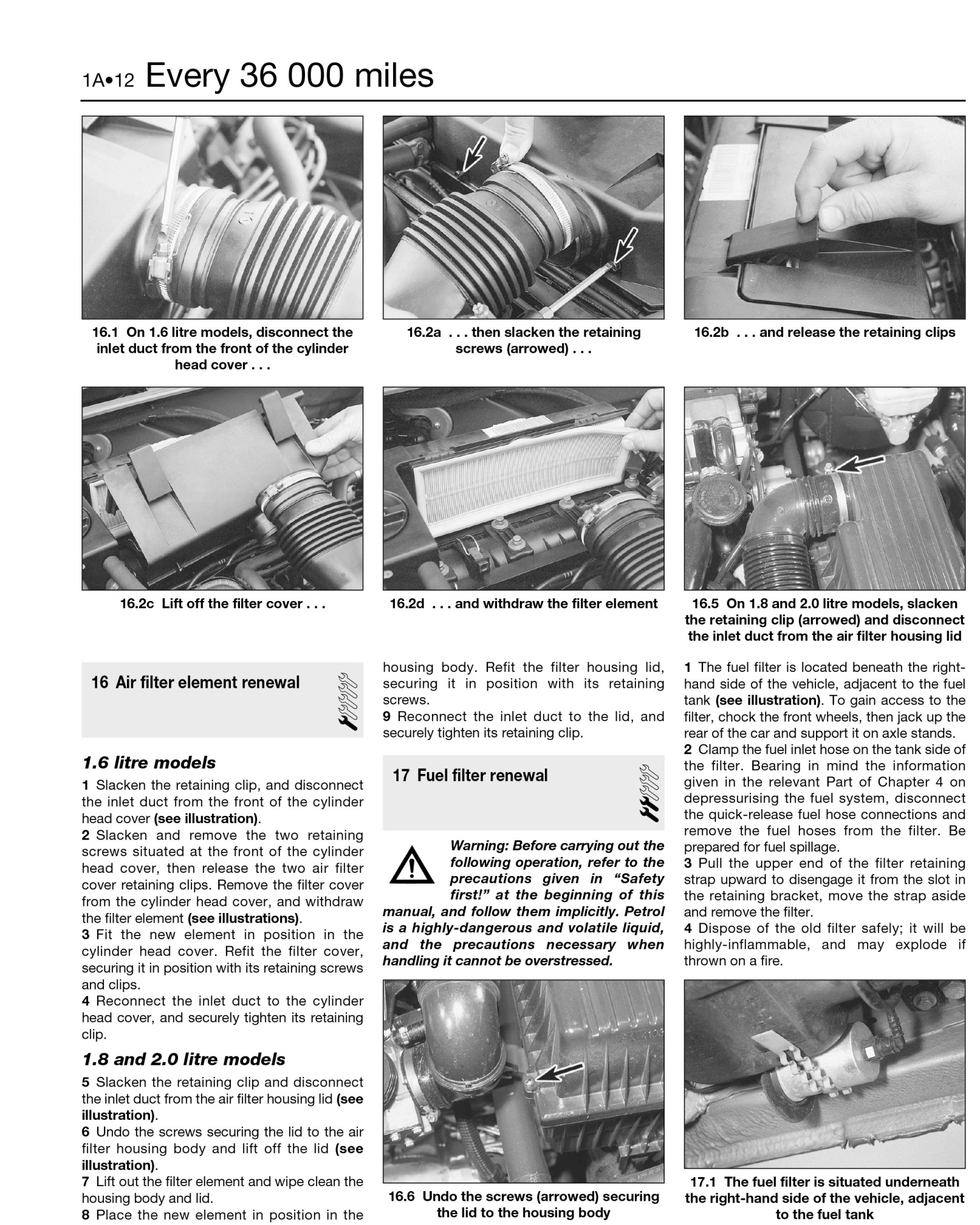 • Página de manual com fotos em preto e branco e instruções para substituição do filtro de ar de motores 1.6 e 1.8/2.0 litros