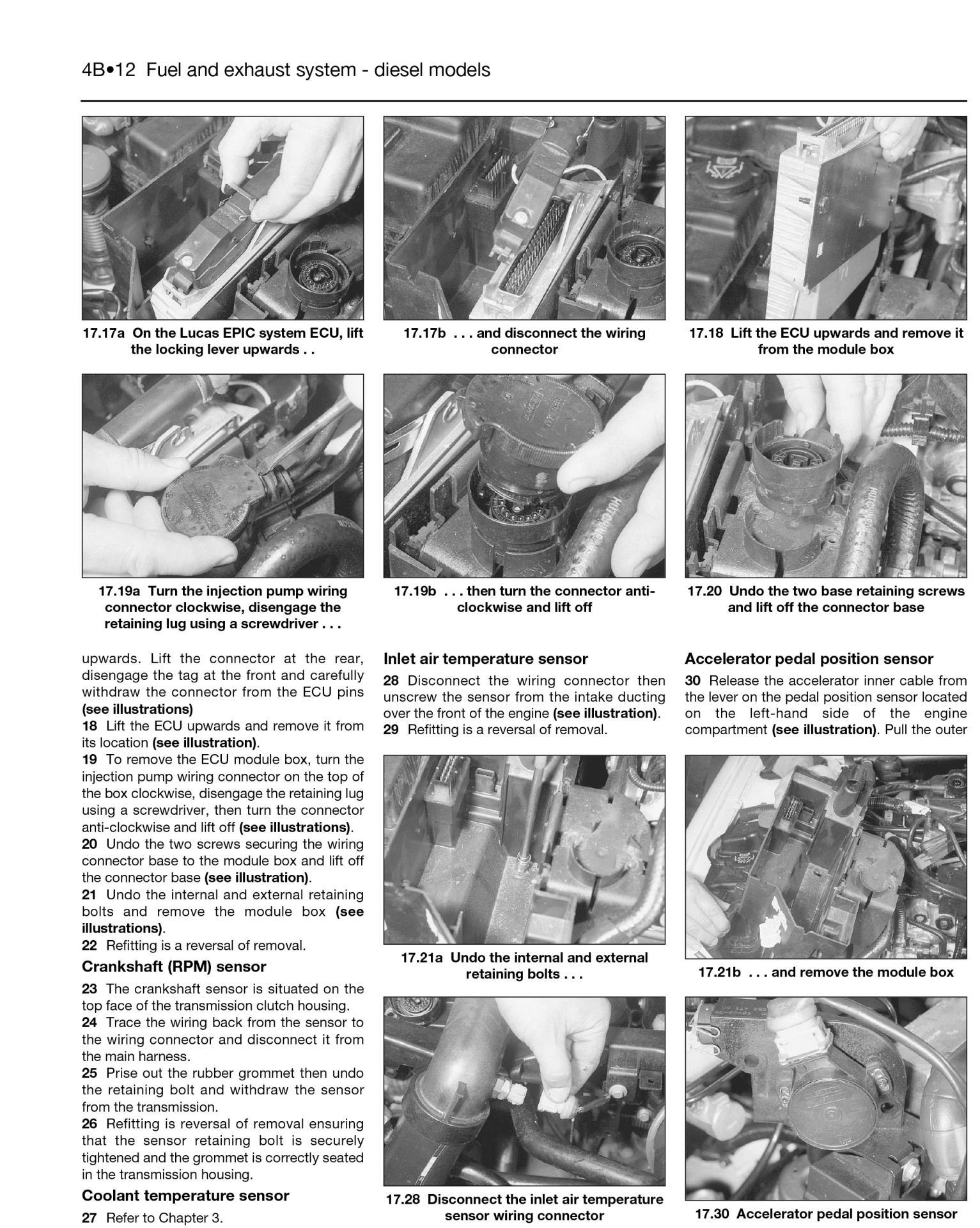 • Instruções técnicas com imagens do sistema de combustível e escape para modelos diesel, destacando a ECU e sensores