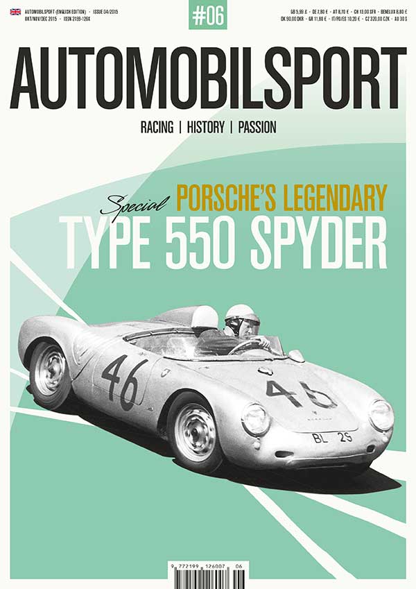 Revista AUTOMOBILSPORT com carro Porsche 550 Spyder prateado e texto em destaque