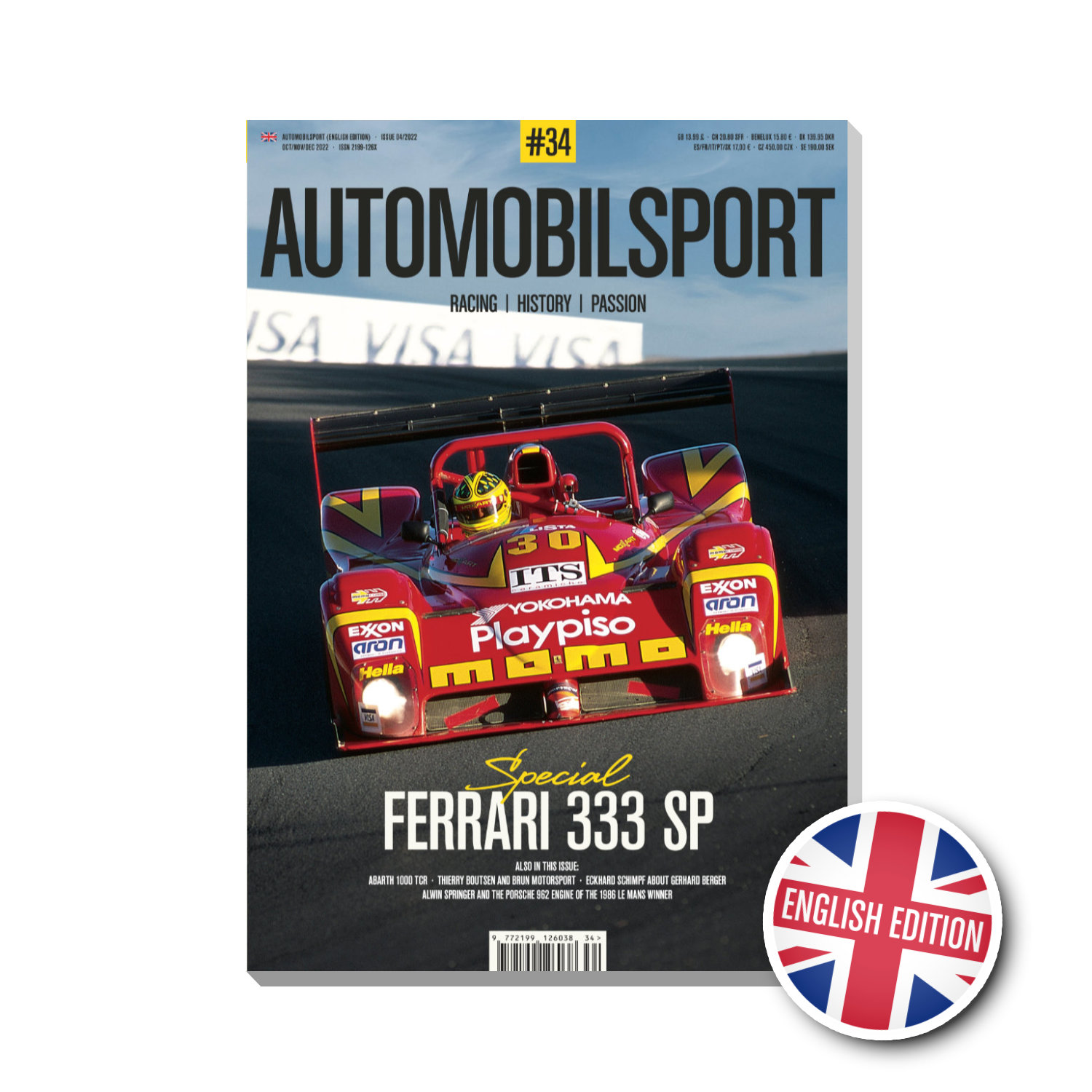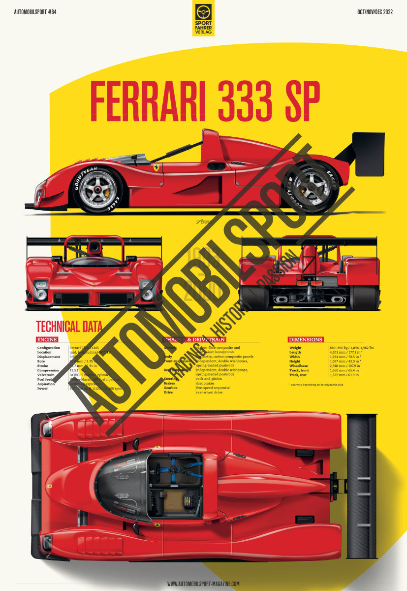 A Ferrari prototype for customers – Development and technology of the 333 SP Piero Ferrari – Carrying on a great name A winning start in America – 1994–1997 Success in Europe – 1998–2003 All wins of the Ferrari 333 SP Interview with Luca Pignacca and Dialma Zinelli from Dallara Jochen Neerpasch about the promotion of young talent Uwe Mahla about the Deutsche Rennsport-Meisterschaft Eckhard Schimpf on Gerhard Berger Thierry Boutsen about Brun Motorsport Etienne Bourguignon about the 31st Gran Premio d'Italia 1960 Kerry Morse and Greg Brown about Alwin Springer Robert Weber about the Zandvoort Historic Grand Prix 2022 Back on Track Fiat Abarth 1000 TCR (Chassis 210 1762) and many more!