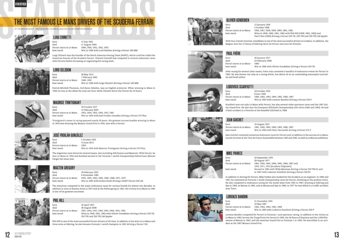 Drivers and works entries – Statistics The first win after the war – The early years 1949–1955 Start of a winning streak – 1956–1961 Spa was his passion, Le Mans his dream – Paul Frère The Le Mans dream team – Phil Hill & Olivier Gendebien The mid-engine prototype era 1961–1969 – From the Ferrari 246 SP to the 312 P A very special year – The 1964 World Sportscar Championship Victory for the underdog – The Ferrari 250 LM of Rindt/Gregory wins at Le Mans in 1965 Swan Song – The last Ferrari sports prototypes at Le Mans 1970–1973 Ferrari 312 PB – The last world champion prototype from Maranello Ferrari 365 GTB/4 Daytona – The heavyweight Ferrari 512 BB – Berlinetta Boxer Ferrari F40 1994–1996 – Unfulfilled potential Ferrari 333 SP – Not built for Le Mans Ferrari 550 Maranello – The last 12-cylinder Ferrari 458 GT2 and 488 GTE – The GTE years 2011–2022 Ferrari 499 P – Great expectations