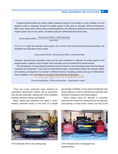 • Página de manual com descrição técnica e imagens de TVR Chimaera 400 em dinamómetro.