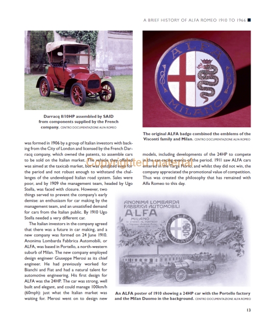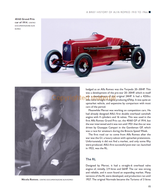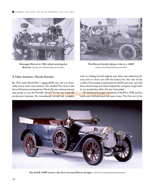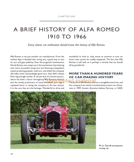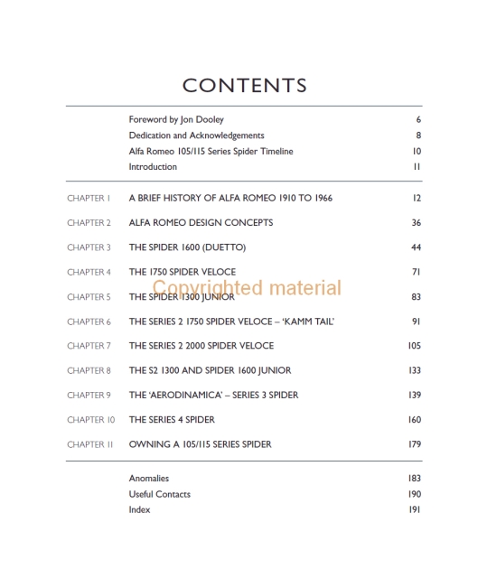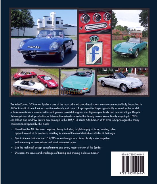 Este livro descreve a história da empresa Alfa Romeo. Detalha a evolução da série 105/115 através de quatro estilos de carroçaria distintos, juntamente com as muitas sub-variações e tipos de mercado externo. Lista as especificações técnicas e todas as principais versões do Spider