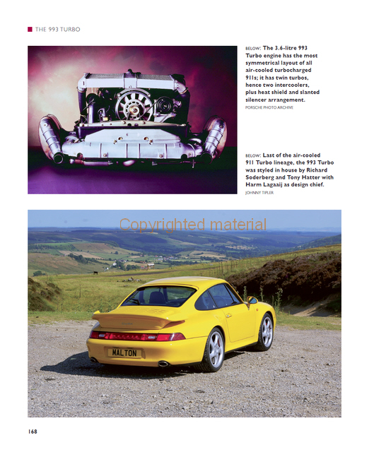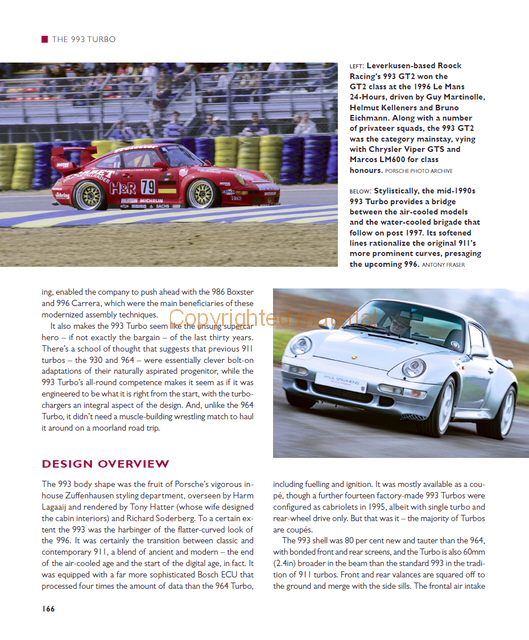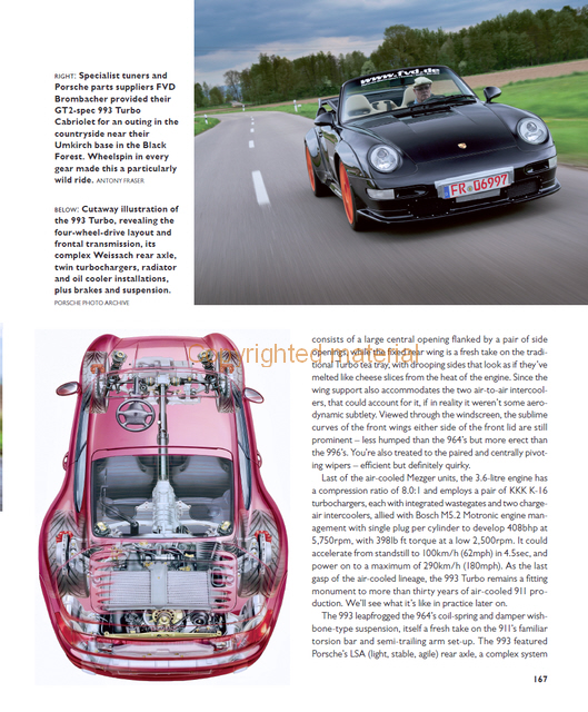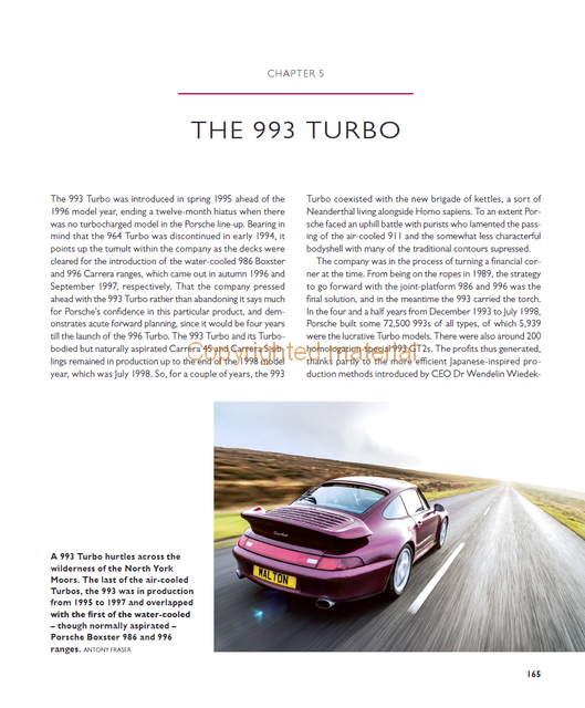 • Porsche 993 Turbo púrpura numa estrada aberta visto de trás, página de livro com texto sobre o carro.