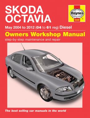 • Capa do manual Haynes para SKODA OCTAVIA Diesel 2004-2012, carro cinzento com capô aberto na capa vermelha