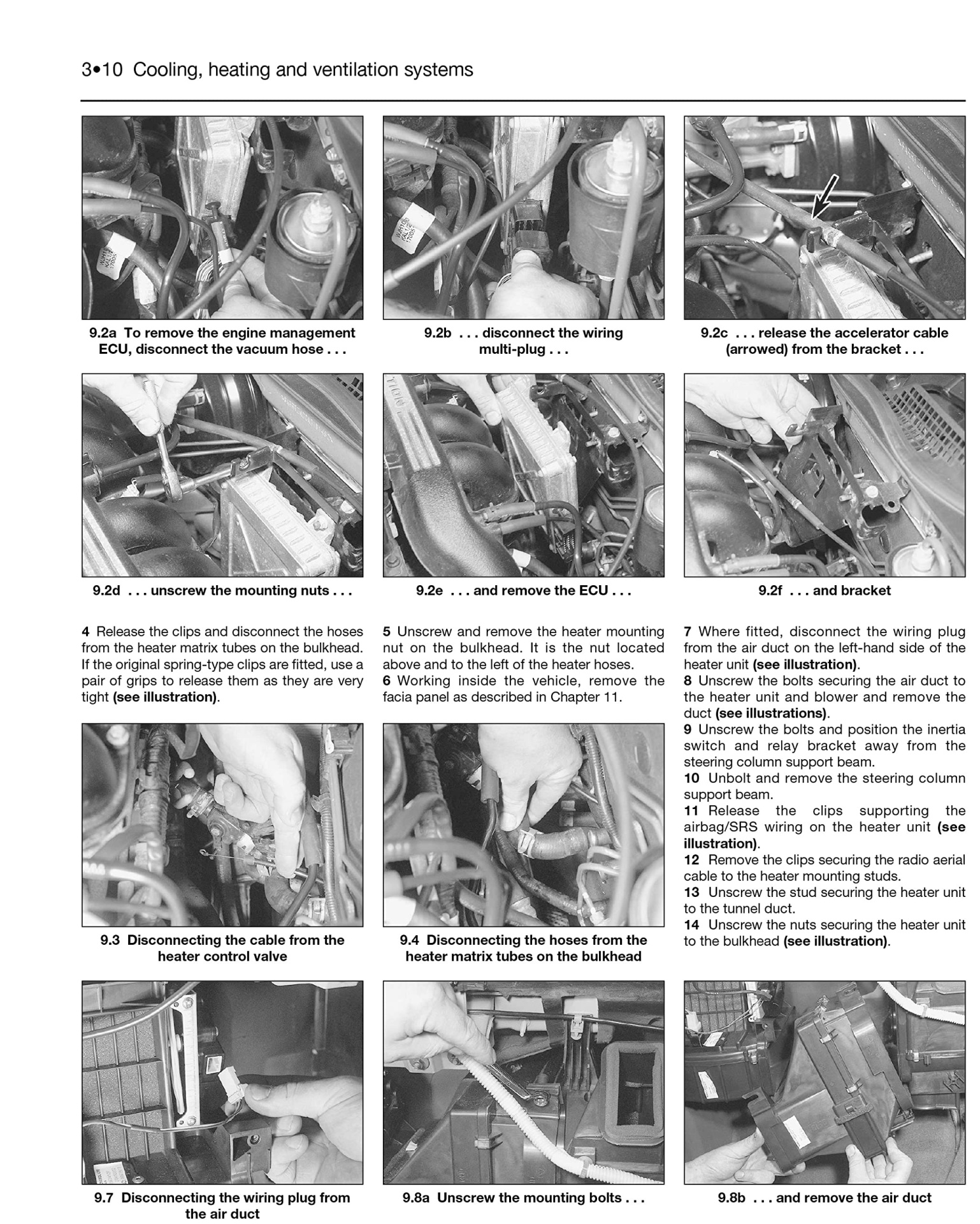 • Sequência de imagens a preto e branco com instruções técnicas para desmontagem de sistema de aquecimento e ventilação automóvel