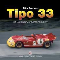 Capa de livro sobre Alfa Romeo Tipo 33 com carro de corrida vermelho e texto no fundo.