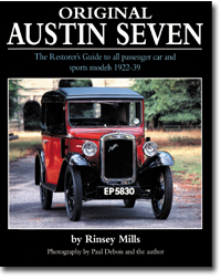 • Capa de livro com fotografia de carro antigo Austin Seven vermelho e preto, texto Original Austin Seven e autor Rinsey Mills
