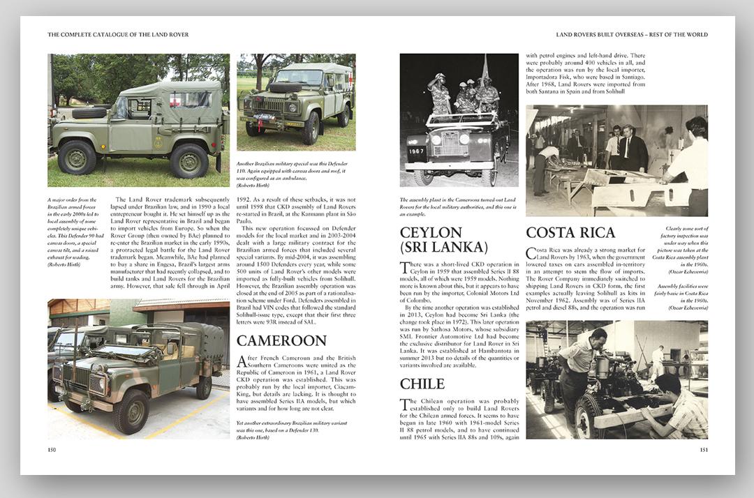 • Páginas de livro aberto com fotos e textos sobre veículos Land Rover clássicos