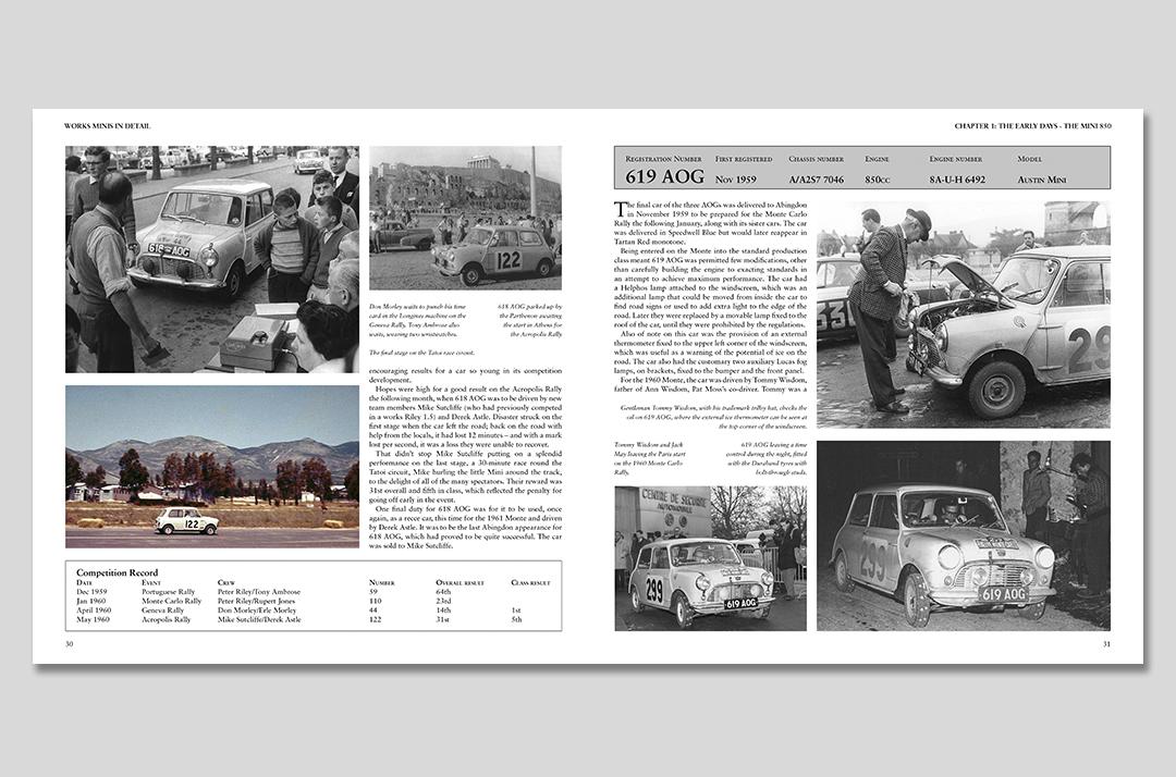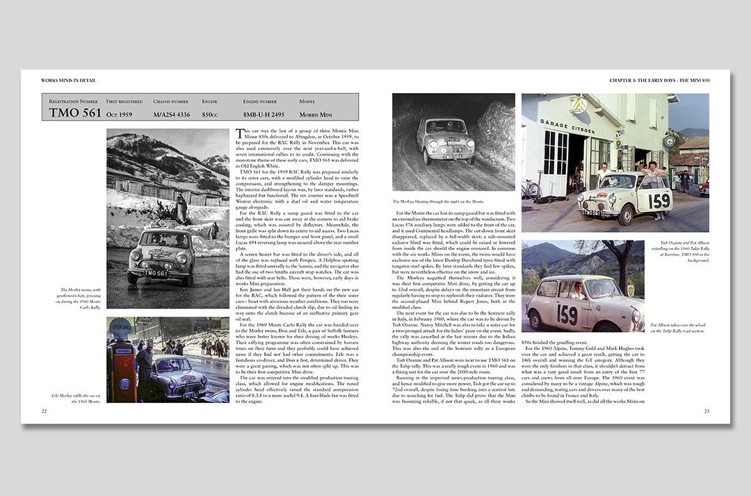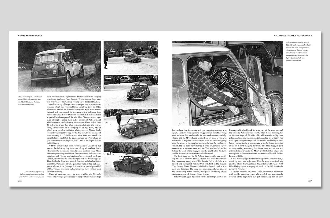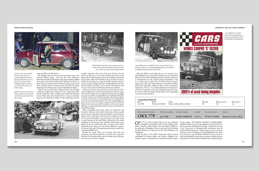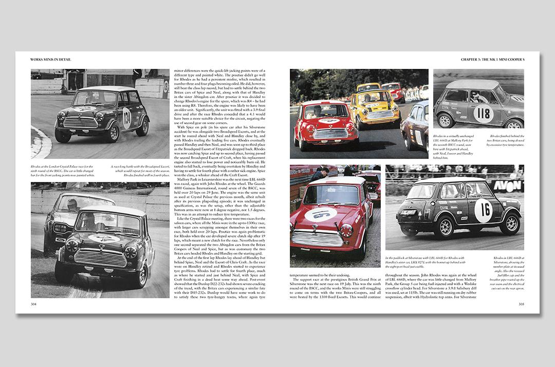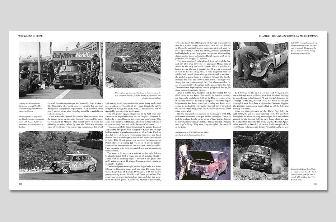 During that 11-year period, 77 works Minis were built, competing in more than 300 events, most of them international rallies. The 1969 season, when the works Minis went racing, is also covered, along with the rallycross events.