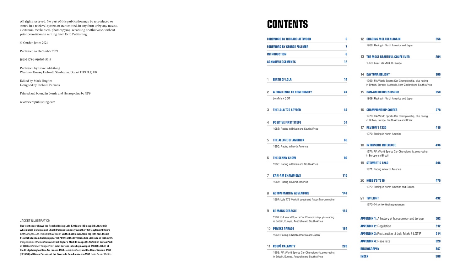 The introduction is a celebration of the genius of Eric Broadley, detailing the Mark 1 sports car and all the other Lola racing cars up to the introduction of the T70, including the involvement of Peter Jackson’s Specialised Mouldings.