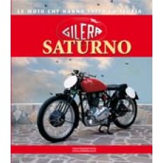 • Capa de livro com uma mota clássica vermelha e preta e texto Gilera Saturno em vermelho e amarelo