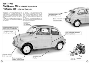 • Diagrama técnico do Fiat Nuova 500 com anotações das peças e motor
