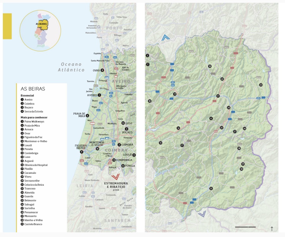 • Mapa turístico da região de As Beiras em Portugal com legendas e símbolos