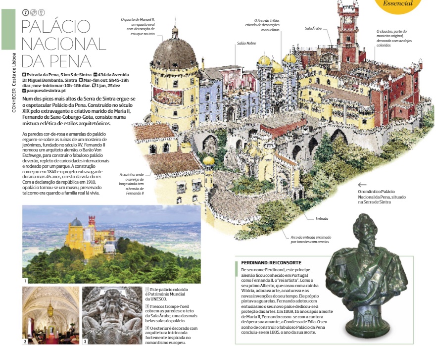 • Ilustração detalhada do Palácio Nacional da Pena com fotos e escultura