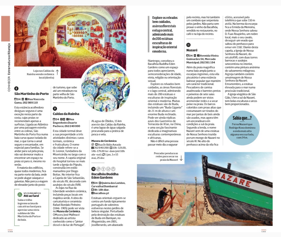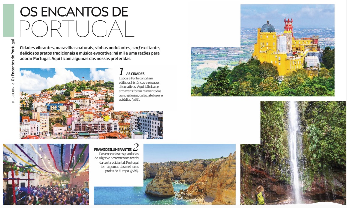 • Página de revista sobre Portugal com várias fotografias de paisagens, festas e património.