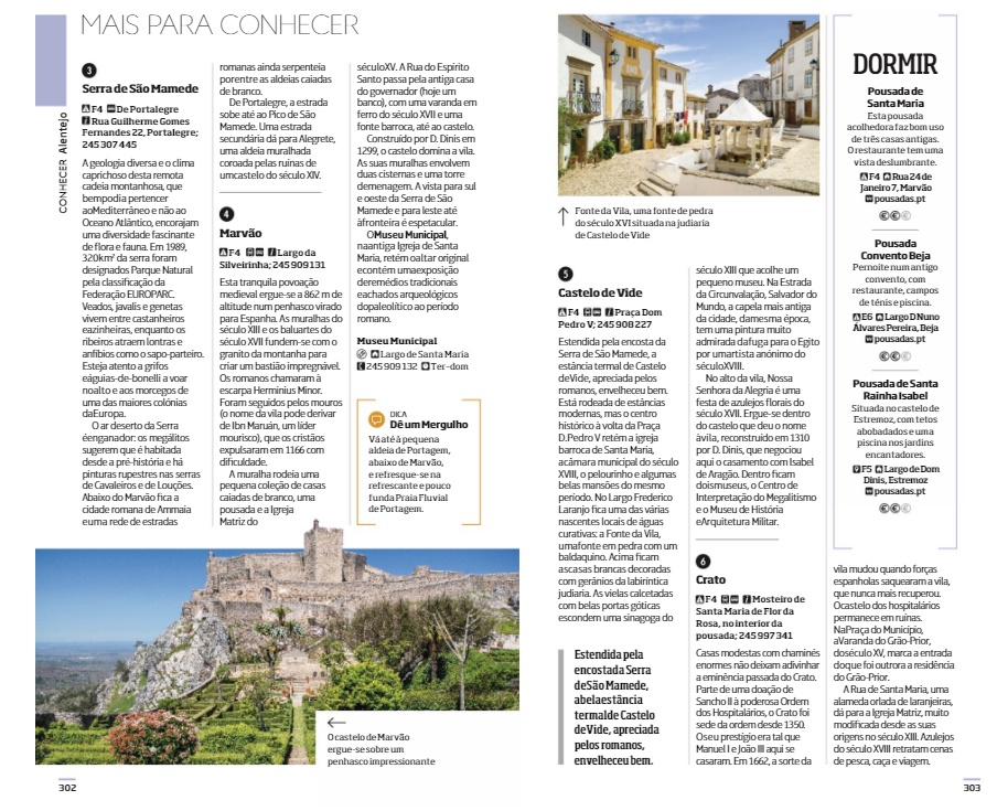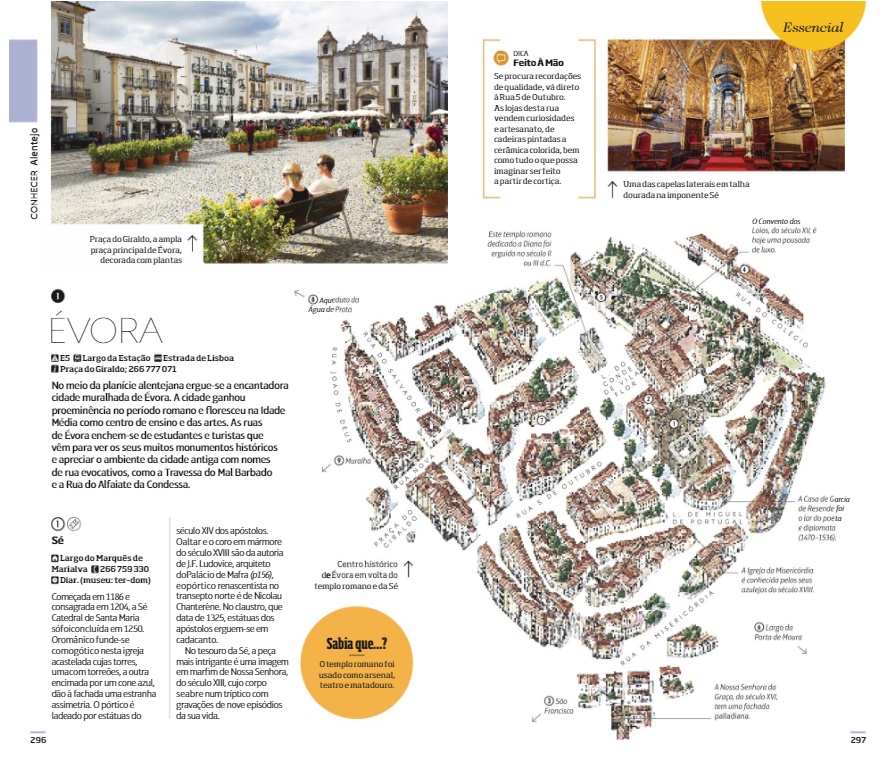 • Página de revista com fotografias e mapa ilustrado de Évora