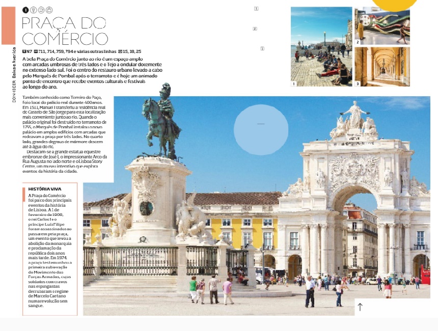 • Página de revista com texto e imagens de locais turísticos, castelo, cidade e casas