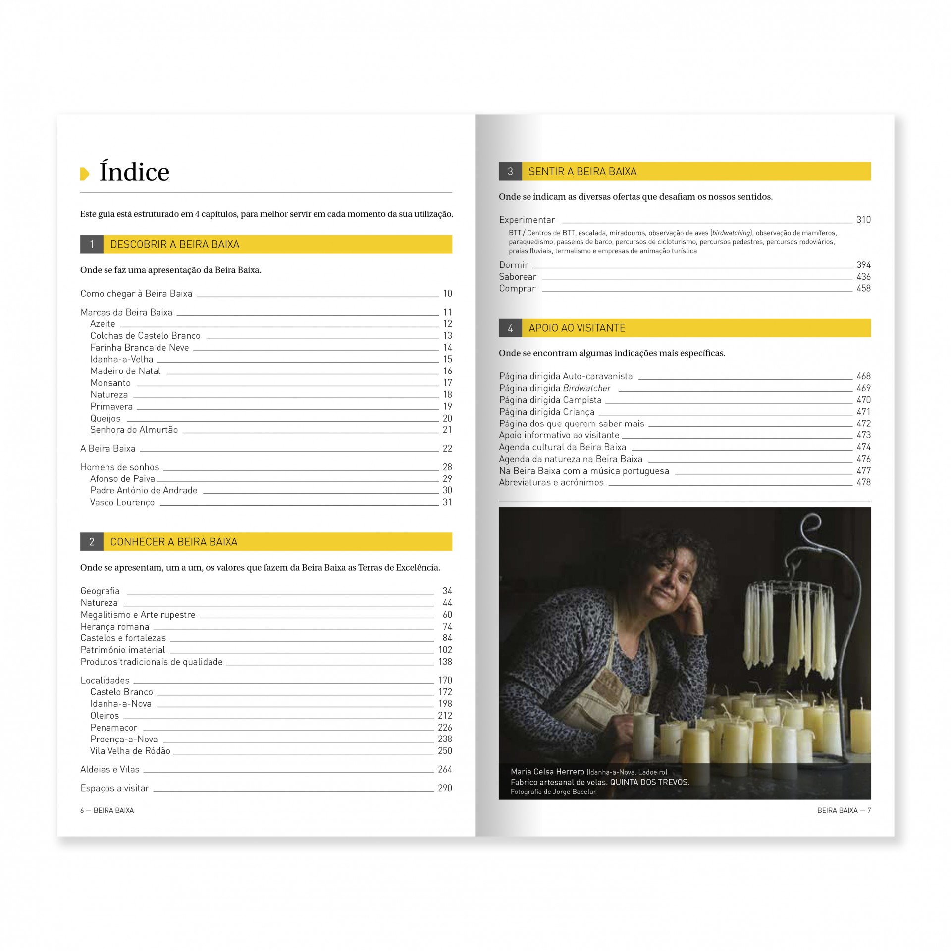 • Página de índice de livro com texto em colunas e foto de mulher ao lado de velas brancas