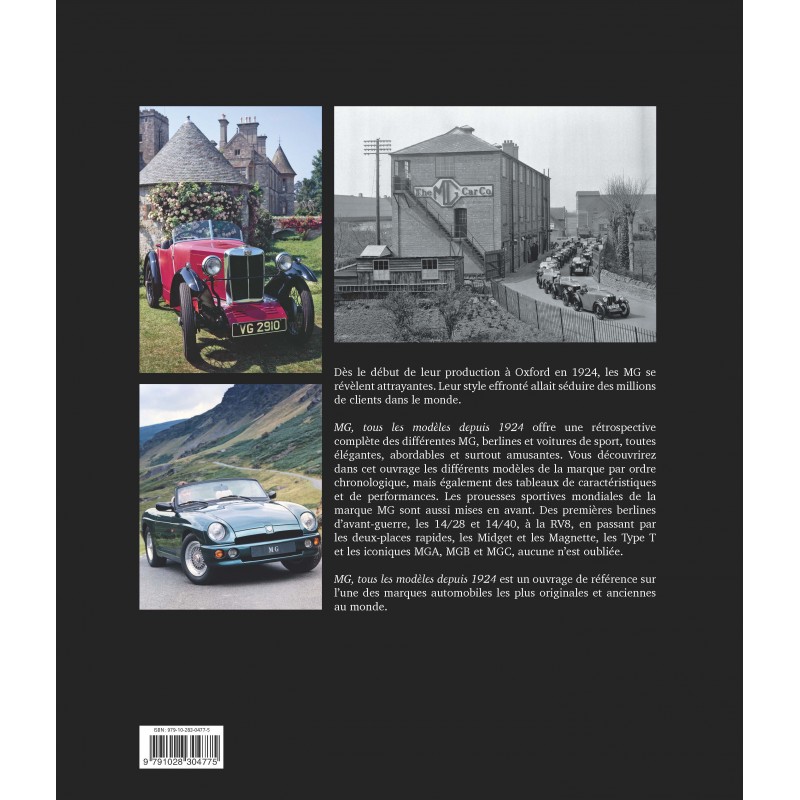 Vous découvrirez dans cet ouvrage les différents modèles de la marque par ordre chronologique, mais également des tableaux de caractéristiques et de performances. Les prouesses sportives mondiales de la marque MG sont aussi mises en avant. Des premières berlines d’avant-guerre, les 14/28 et 14/40, à la RV8, en passant par les deux-places rapides, les Midget et les Magnette, les Type T et les iconiques MGA, MGB et MGC, aucune n’est oubliée.