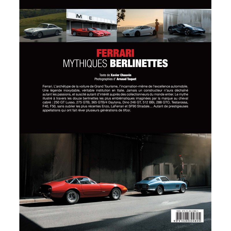 • Contracapa do livro 'Ferrari Mythiques Berlinettes' com duas fotos de carros Ferrari vermelhos e azuis em cenário urbano.