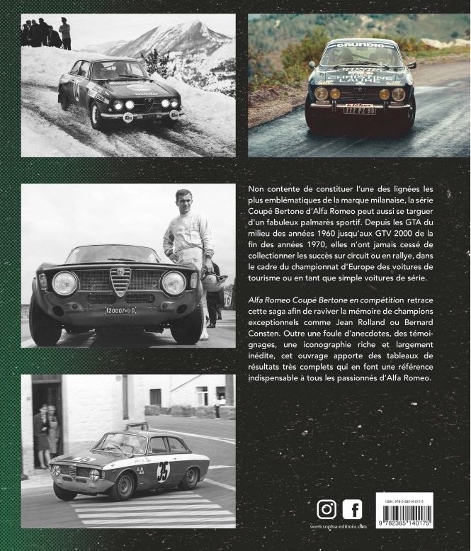 Alfa Romeo Coupé Bertone en compétition retrace cette saga afin de raviver la mémoire de champions exceptionnels comme Jean Rolland ou Bernard Consten. Outre une foule d’anecdotes, des témoignages, une iconographie riche et largement inédite, cet ouvrage apporte des tableaux de résultats très complets qui en font une référence indispensable à tous les passionnés d’Alfa Romeo.