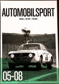• Capa de revista AUTOMOBILSPORT com carro de corrida branco numa estrada