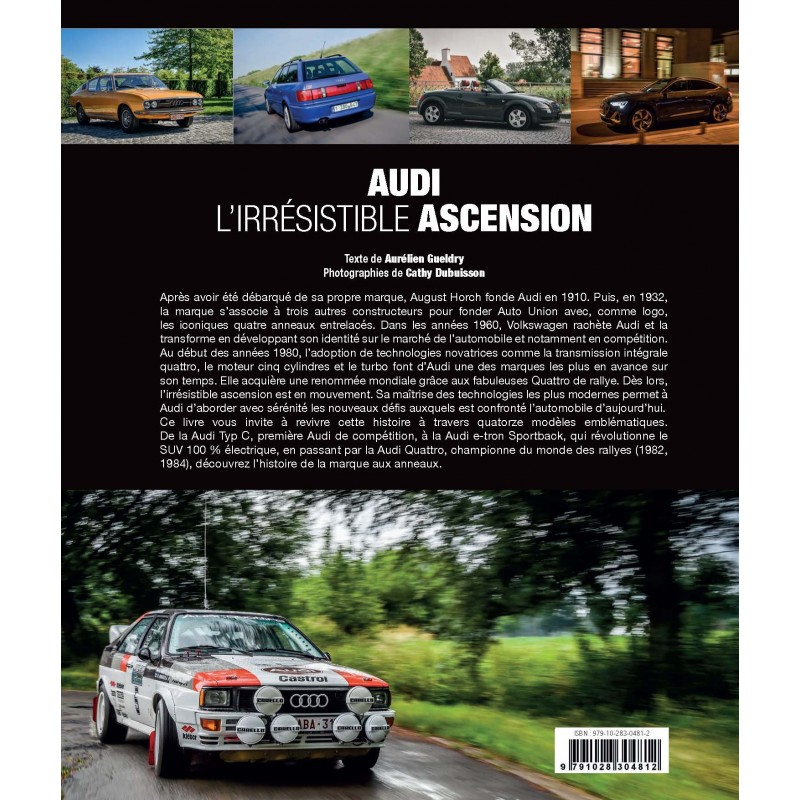 Ce livre invite à revivre cette histoire à travers 14 modèles emblématiques. De la Audi TypC, première Audi de compétition, à la Audi e-tron Quattro, qui révolutionne le SUV 100 % électrique, en passant par la Audi Quattro, championne du monde des rallyes (1982, 1984), découvrez la marque aux anneaux, grâce à des visuels inédits.