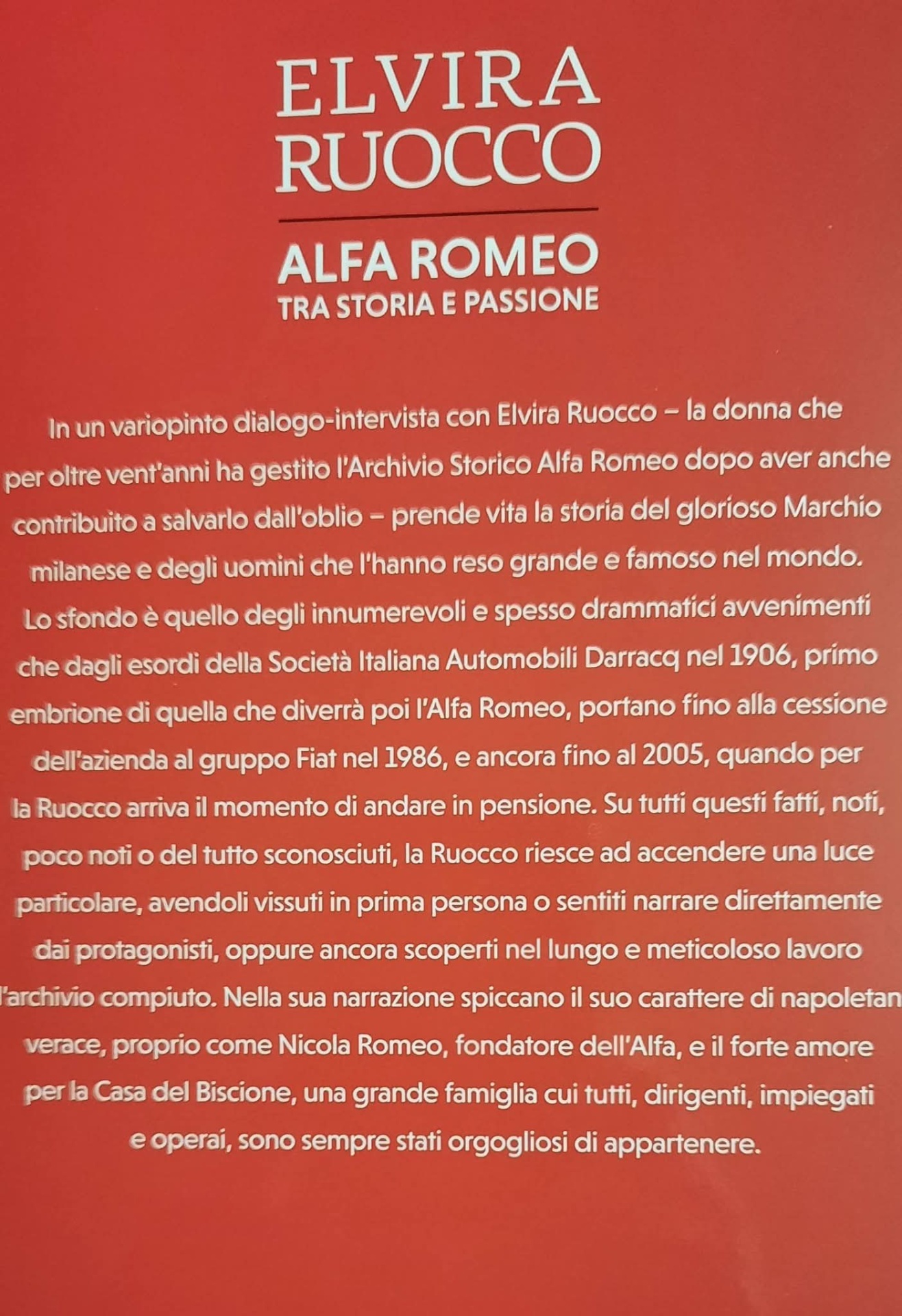 Num diálogo e entrevista envolventes com Elvira Ruocco — a mulher que geriu o Arquivo Histórico da Alfa Romeo por mais de vinte anos, chegando a salvá-lo do esquecimento — a história da gloriosa marca milanesa e dos homens que a tornaram grandiosa e famosa mundialmente ganha vida. O pano de fundo são os inúmeros e muitas vezes dramáticos eventos que começaram com a fundação da Società Italiana Automobili Darracq em 1906, a base embrionária do que mais tarde se tornaria a Alfa Romeo, passando pela venda da empresa para o Grupo Fiat em 1986, e novamente até 2005, quando chegou a hora de Ruocco se aposentar.