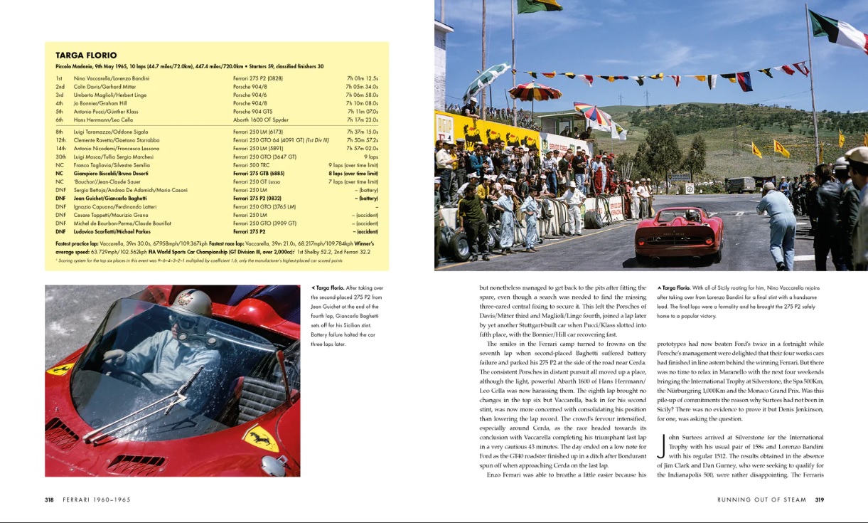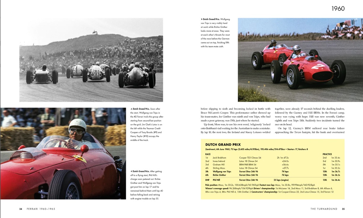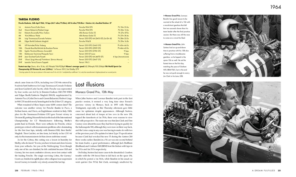 The subject of this book is Ferrari’s racing history from 1960 to 1965, a period that was one of the most successful in the marque’s history so far. In this era, which began with completion of the transition from front-engined to rear-engined configuration, Scuderia Ferrari won just about everything with a variety of iconic machinery that included the ‘shark-nose’ 156 and the fabled 250 GTO. Driving Formula 1 Ferraris, Phil Hill and John Surtees delivered two World Championship titles in the space of four years. Ferrari sports cars racked up a string of six consecutive victories in the Le Mans 24 Hours, a feat subsequently surpassed only by Porsche. This book covers this period in detail for the first time and exclusively features the work of one of the greatest racing photographers ever.
