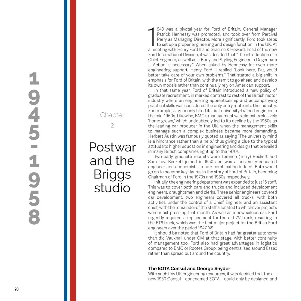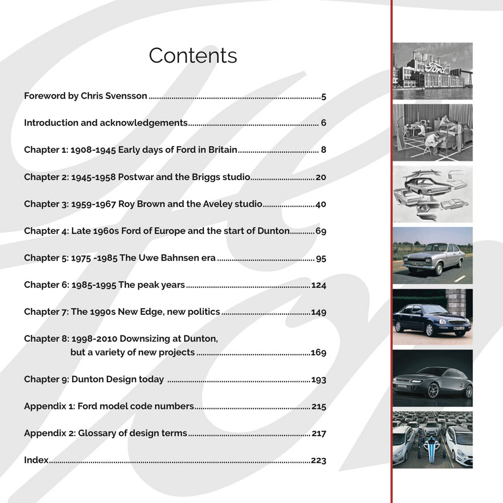 Como profissão, o design automotivo mudou muito no último século e continua a evoluir à medida que novos processos são desenvolvidos. Este livro mostra o desenvolvimento dos projetos da Ford no Reino Unido, particularmente aqueles projetados no estúdio Dunton, que foi inaugurado em 1967 e ainda é uma parte fundamental dos recursos de design da Ford na Europa. Desde os primeiros desenhos de giz e modelos de madeira para o Consul até as renderizações digitais de hoje e argilas moídas para o mais recente Transit, os designers e técnicos da Ford nunca tiveram falta de criatividade.