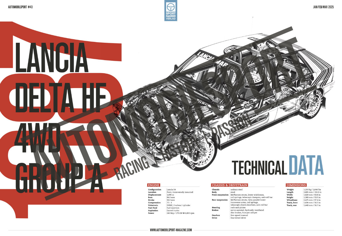 Inclui um poster desdobrável em tamanho grande com a matéria de capa, com ilustração e detalhes tecnicos de Lancia Delta HF 4WD Gruppe A 1987