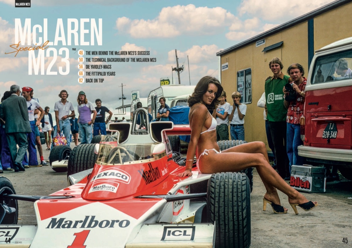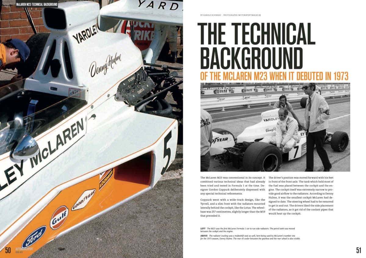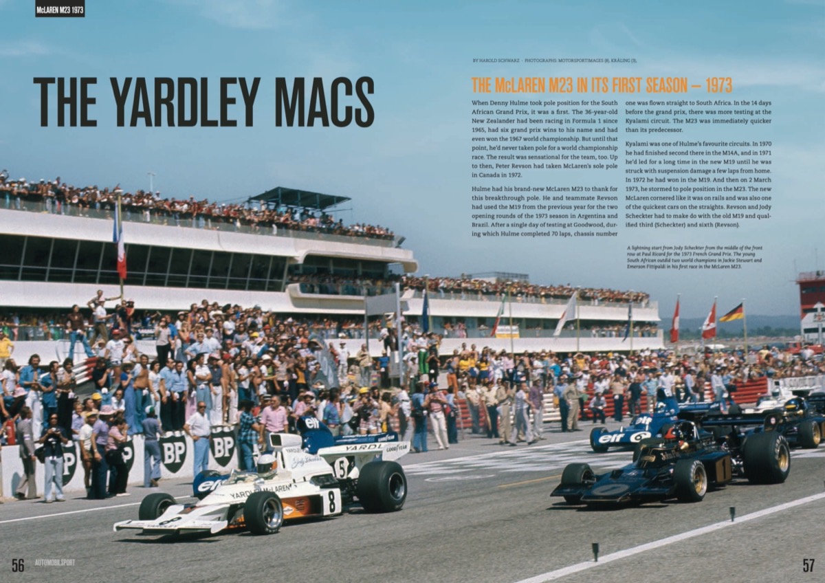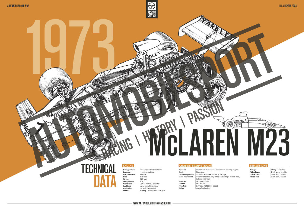 The men behind the McLaren M23's success The technical background of the McLaren M23 when it debuted in 1973 The Yardley Macs – The McLaren M23 in its first season — 1973 The Fittipaldi years – Conquering the first drivers’ title and manufacturers’ cup Back on top – Second drivers’ title and swansong