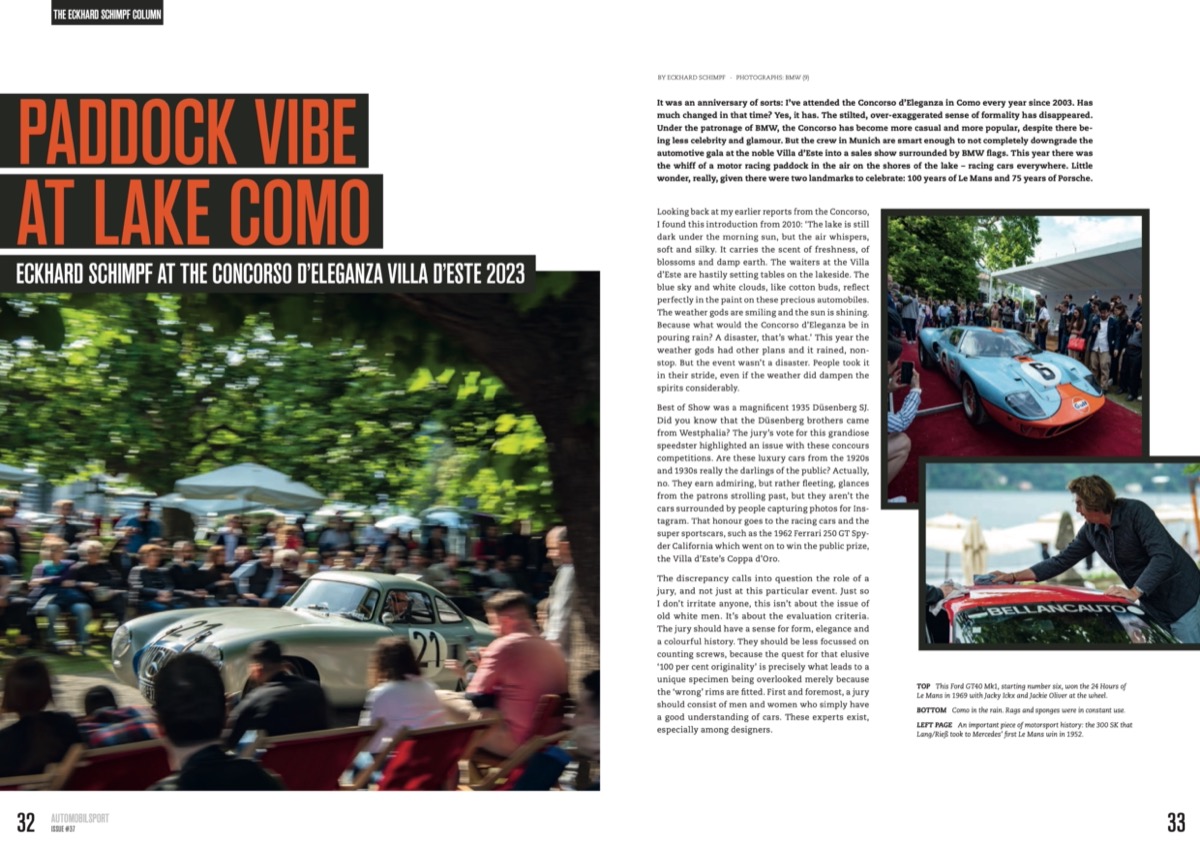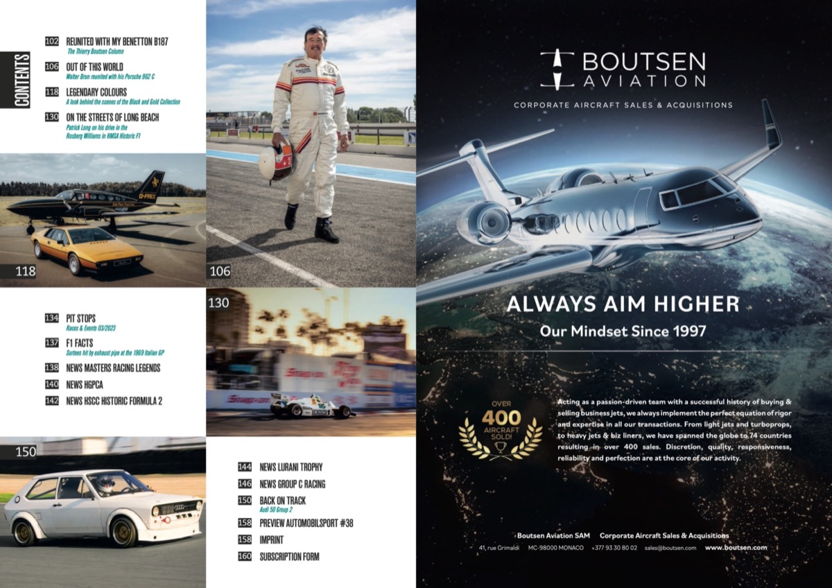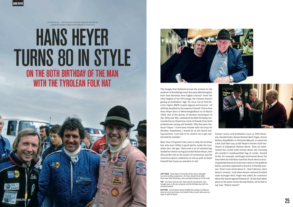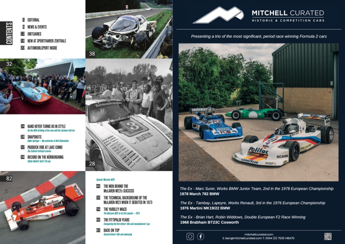Uwe Mahla on the 80th birthday of Hans Heyer Alwin Springer on Rolf Stommelen Eckhard Schimpf about Concorso d' Eleganza Villa d' Este 2023 Ugo Vincenzi on Stefan Bellofs record lap on the Nürburgring Thierry Boutsen about his Benetton B187 Patrick Long on his drive in the Rosberg Williams in HMSA Historic F1 Back on Track – Audi 50 Group 2 and many more!