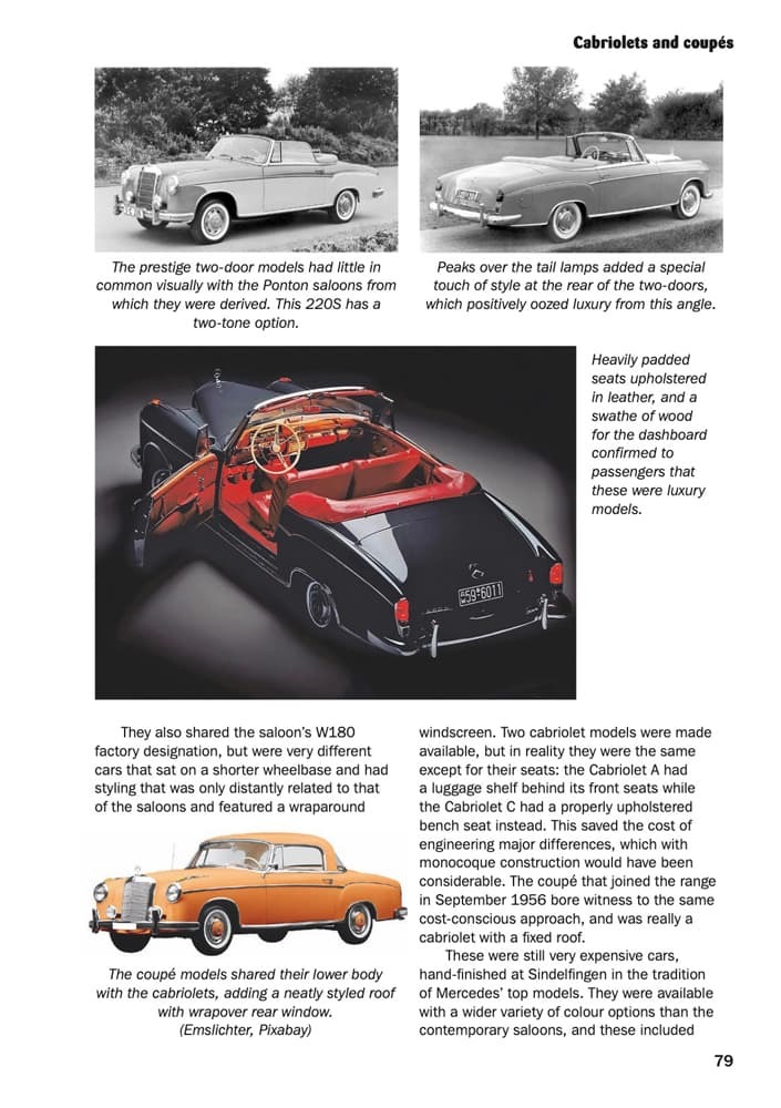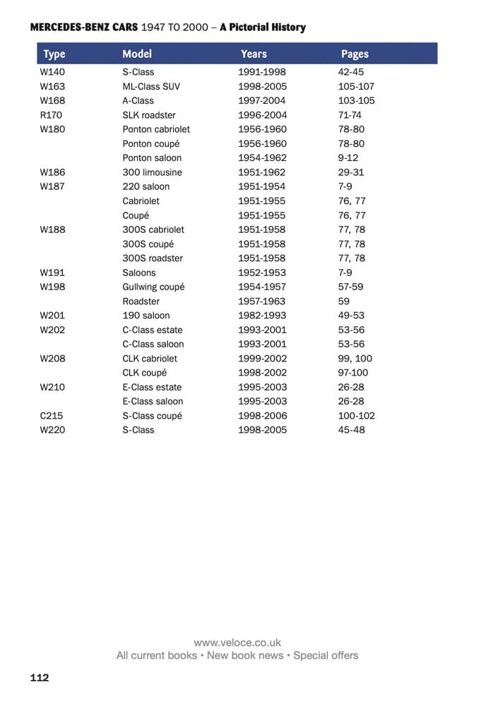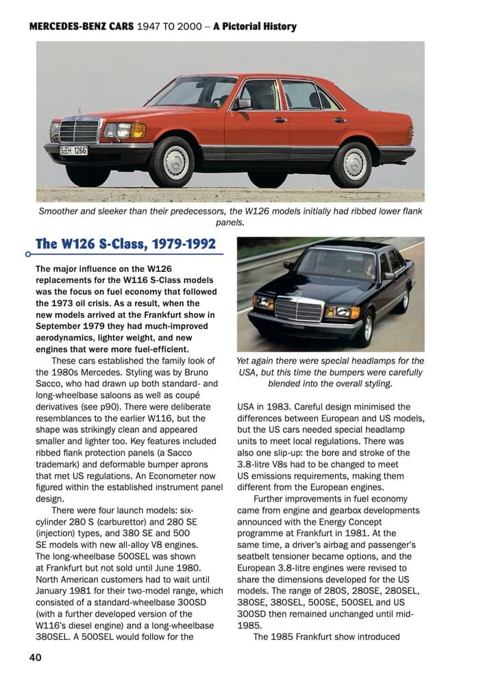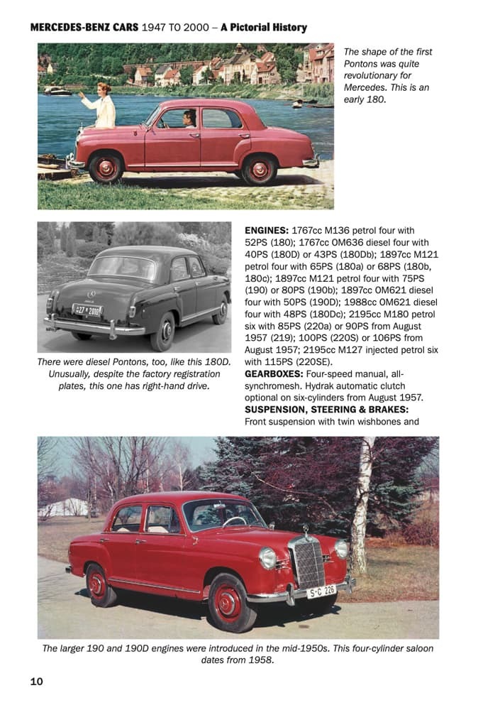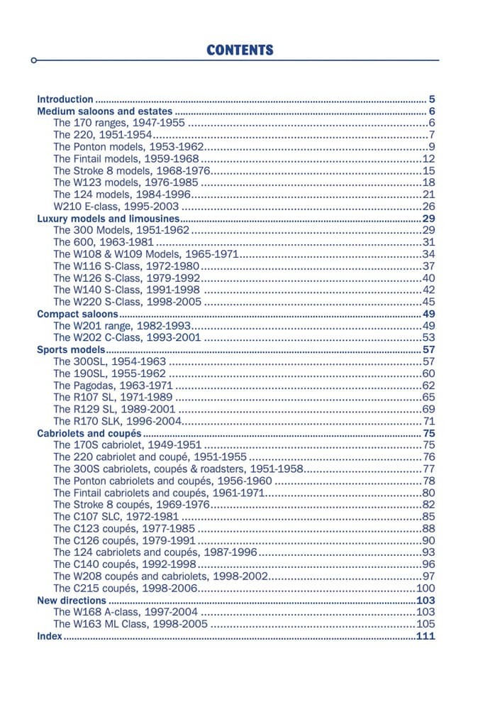 Starting with a brief description of the pre-war cars, which continued on when production restarted, the book continues in chronological order with all model class ranges and individual models right up to 2000, when model designation and design changed.