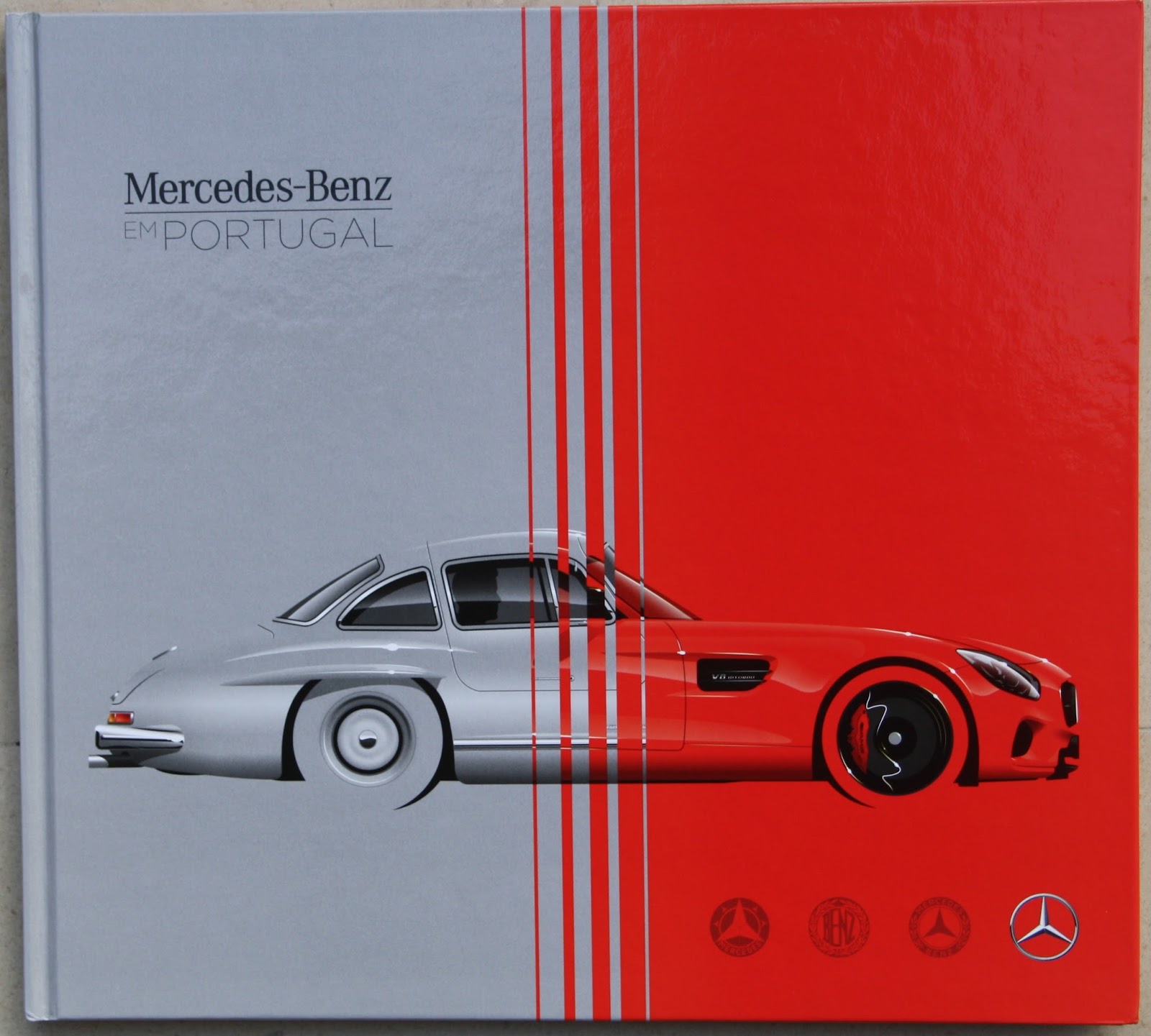 • Capa de livro cinzenta e vermelha com carro Mercedes-Benz dividido ao meio e texto de título