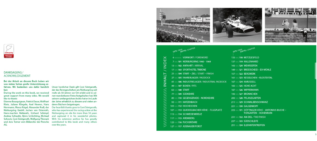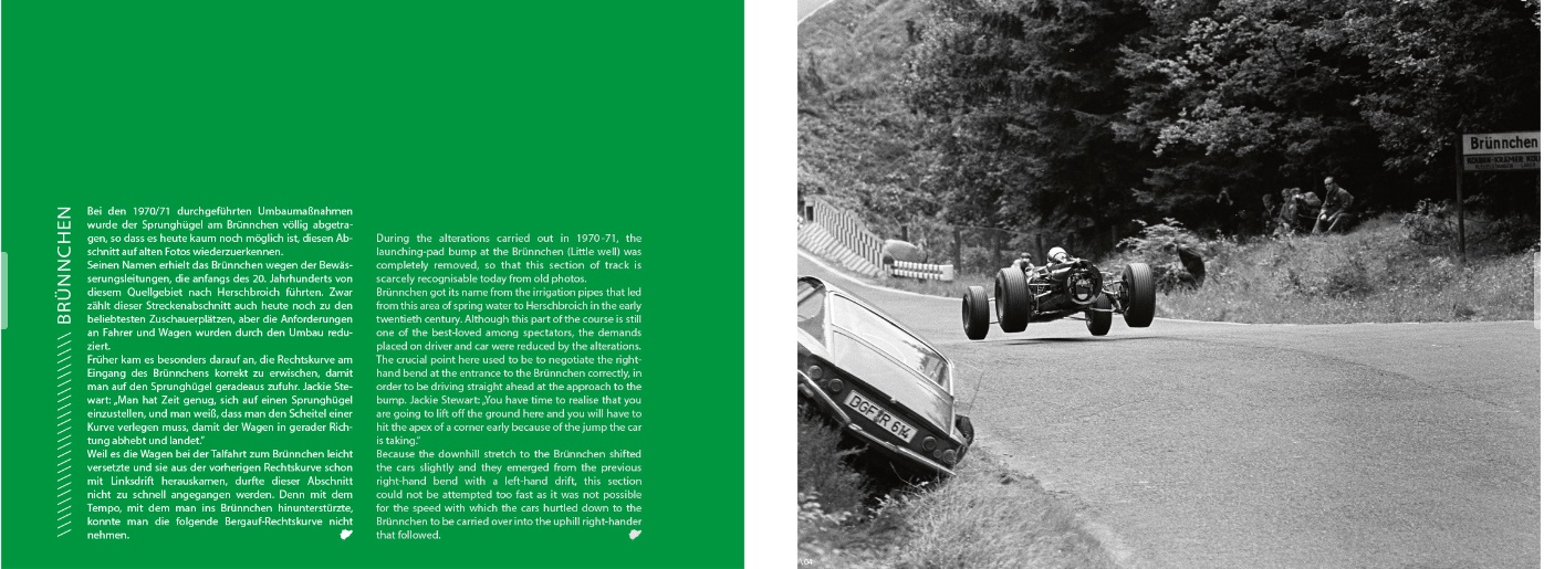 With this book, come along for a spin around the ‘Ring during the exciting 1960s. Unique atmospheric photographs show the ‘Ring with all the colourful hustle and bustle on the track, in the pits and in the paddock, as well as providing diverse impressions of the races themselves. The text and pictures take you from one section of track to the next, starting in the Eifel forest idyll of Hatzenbach to the adventures of the tourist drivers in the Adenauer Forst, then on to flying formula racers at the Brünnchen and to sports cars passing tent cities at the Schwalbenschwanz.