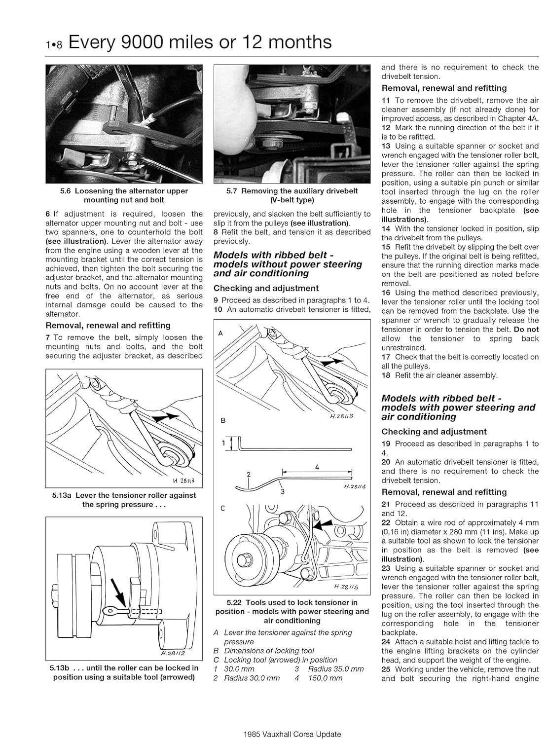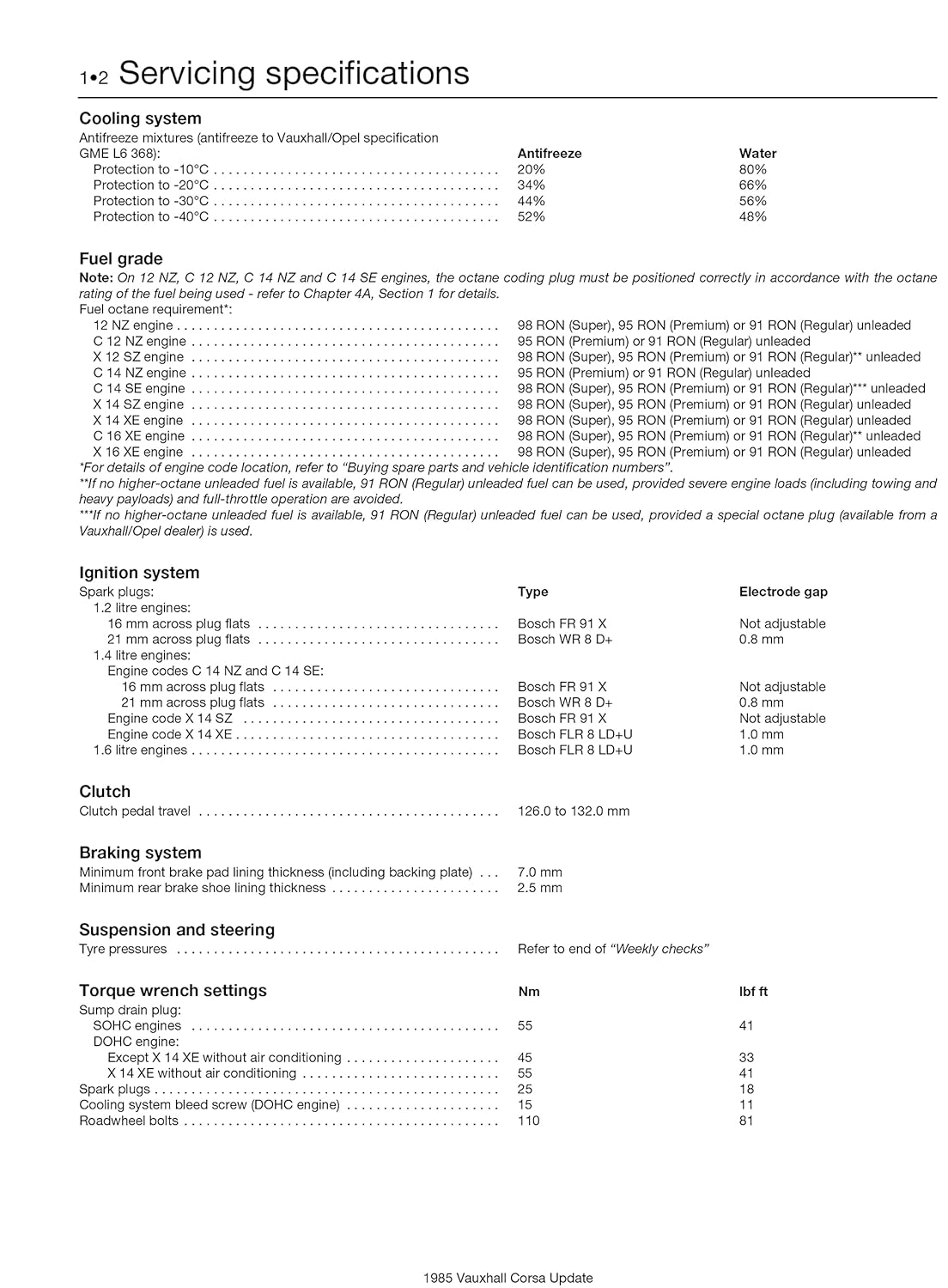 • Página de documento técnico com tabelas e texto sobre especificações de manutenção automóvel Vauxhall/Opel.