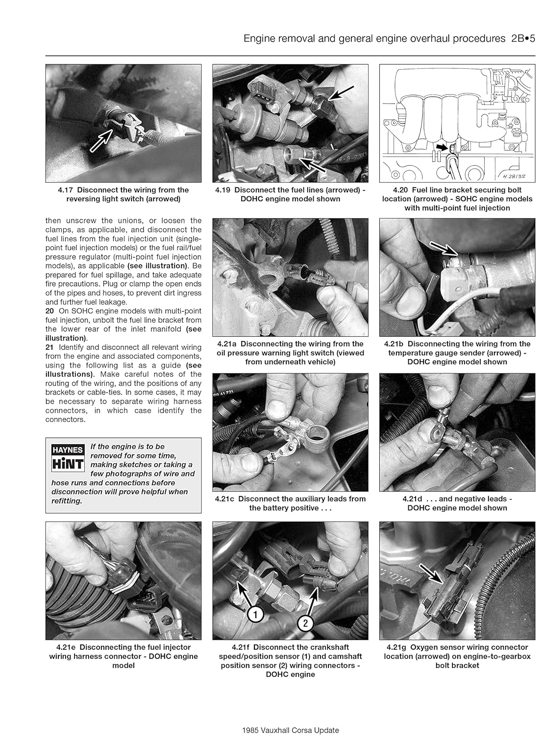 • Imagens técnicas de desconexão de fios e sensores em motores automóveis com setas indicativas e texto explicativo.