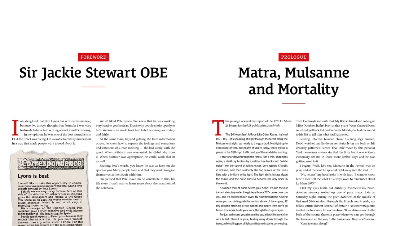 As Sir Jackie Stewart states in his Foreword, “Pete Lyons was one of the best journalists in Formula 1 at the time I was racing.” Lyons himself writes that when he became obsessed with motor racing, “It felt like my true road.”