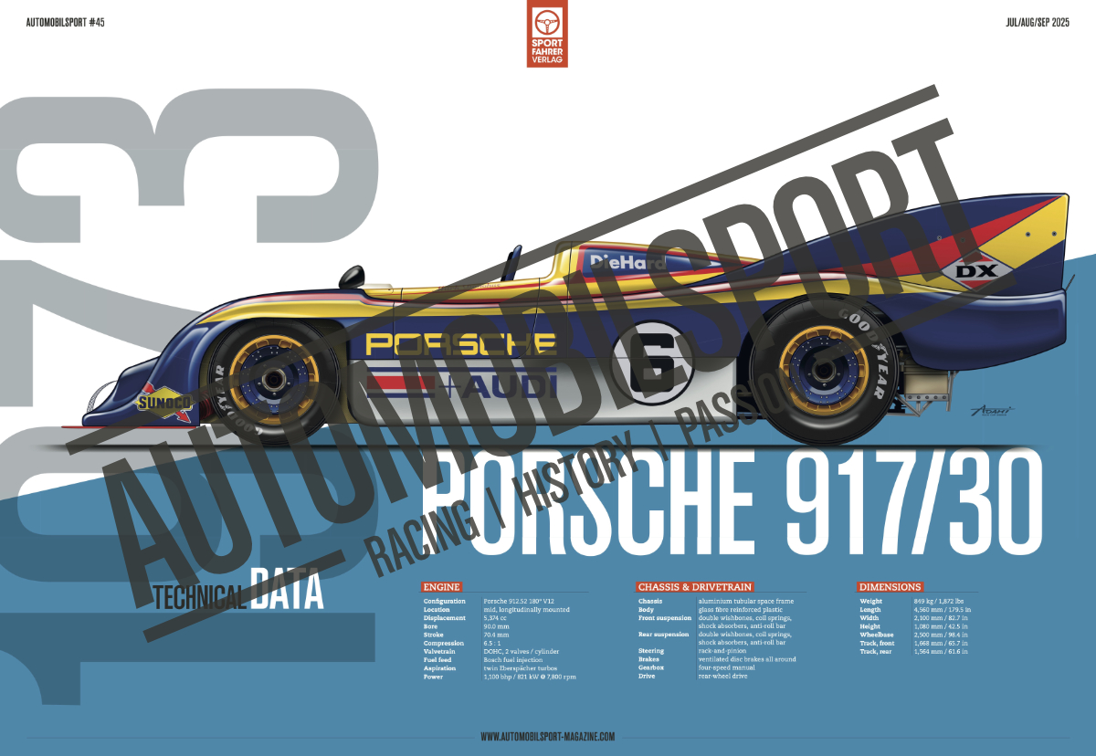 Inclui um poster desdobrável em tamanho grande com a matéria de capa, com ilustração e detalhes tecnicos do Porsche 917/30 1973