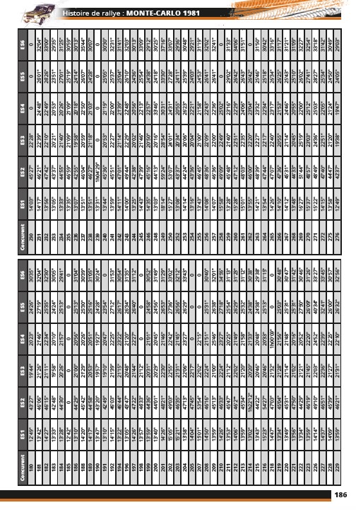 • Tabela detalhada de dados do rali Monte-Carlo 1981 em preto e branco