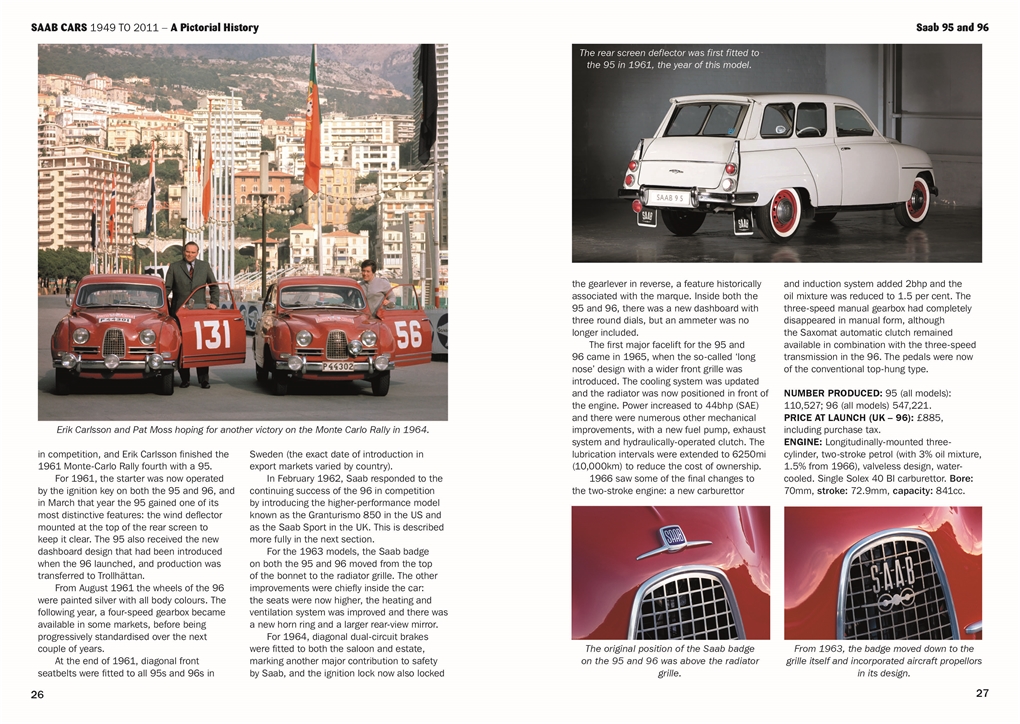 Individual chapters are devoted to each of Saab’s models, including the 93 and 96 saloons, which enjoyed much success in rallying, the 95 station wagon and the striking Sonett sports cars. The SaabO caravan and the Formula Junior racing car that Saab built during this period are also presented.