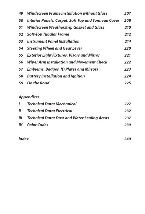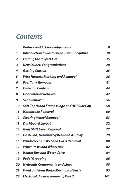 • Índice de livro sobre restauro de Triumph Spitfire com capítulos listados e números de página