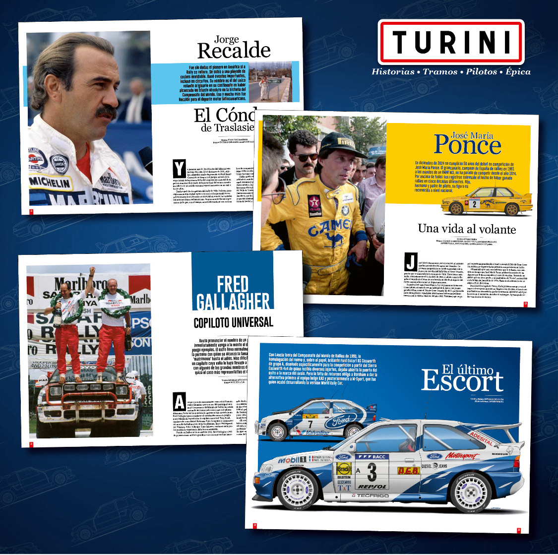 • Páginas de revista com fotos e textos sobre rally e pilotos famosos, fundo azul, logótipo TURINI.